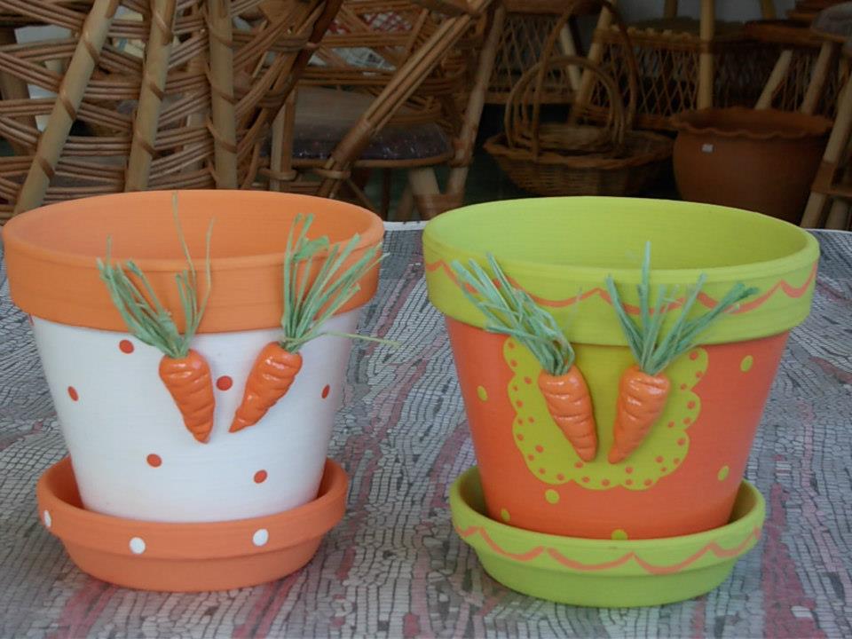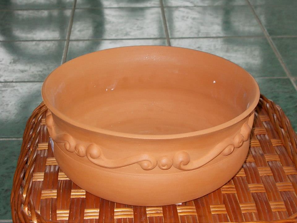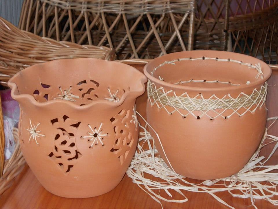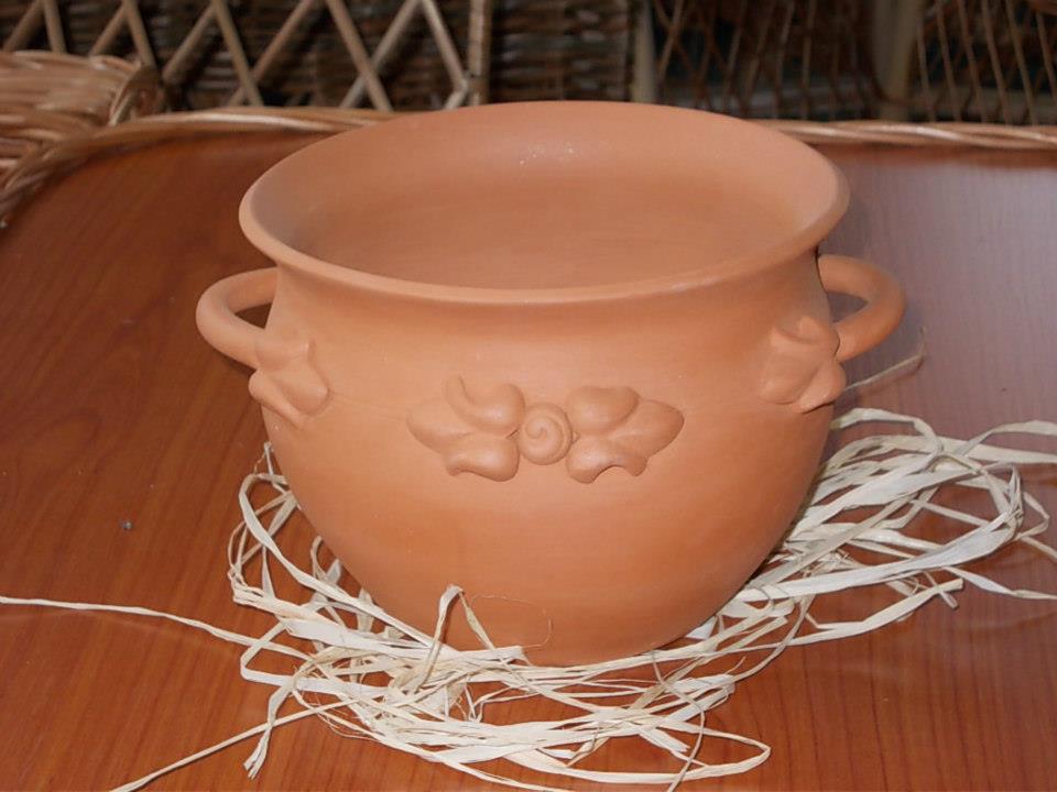 Ukrasna korpa od terakote sa cvetnim motivima i saksije za cvece razlicitih velicina