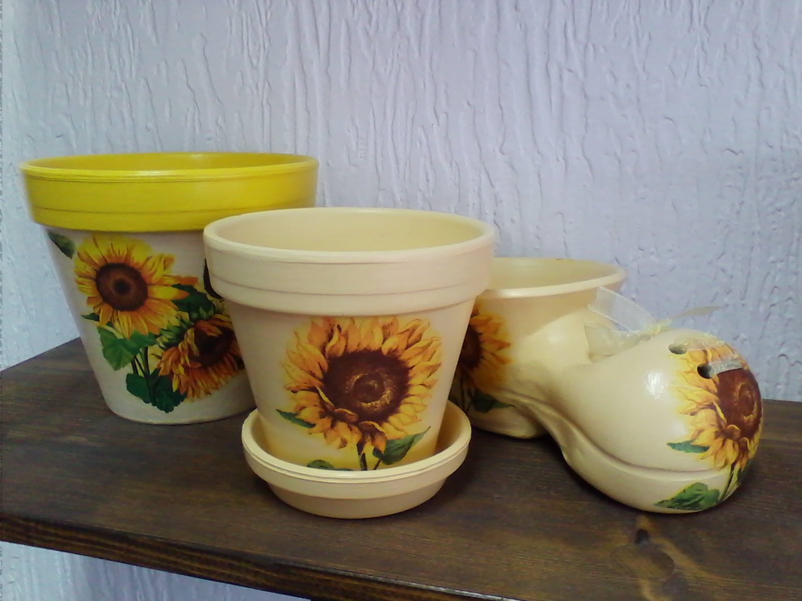 Ukrasne saksije od terakote sa motivima suncokreta veca precnika 16 cm i manja precnika 12 cm i ukrasna mala cipela za cvece.